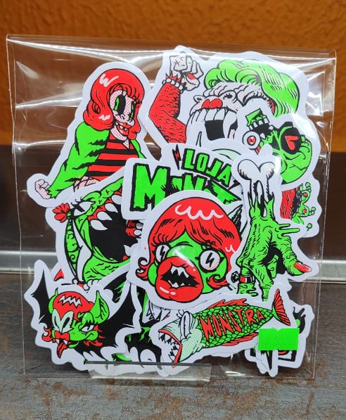Desenhos exclusivos do senhor das moscas Benson Chin! Feitos em serigrafia, tinta especial e acabamento fosforescente (brilha no escuro!) Pode colocar numa xícara, lavar de bucha e a tinta não sai! COISA BOA! Pacote com: 2 – adesivos tamanho GG 2 – adesivos tamanho G 4 – adesivos tamanho M 3 – adesivos tamanho P 5 – adesivos tamanho PP (cores e modelos variam) (não vem desenho repetido no pacote)