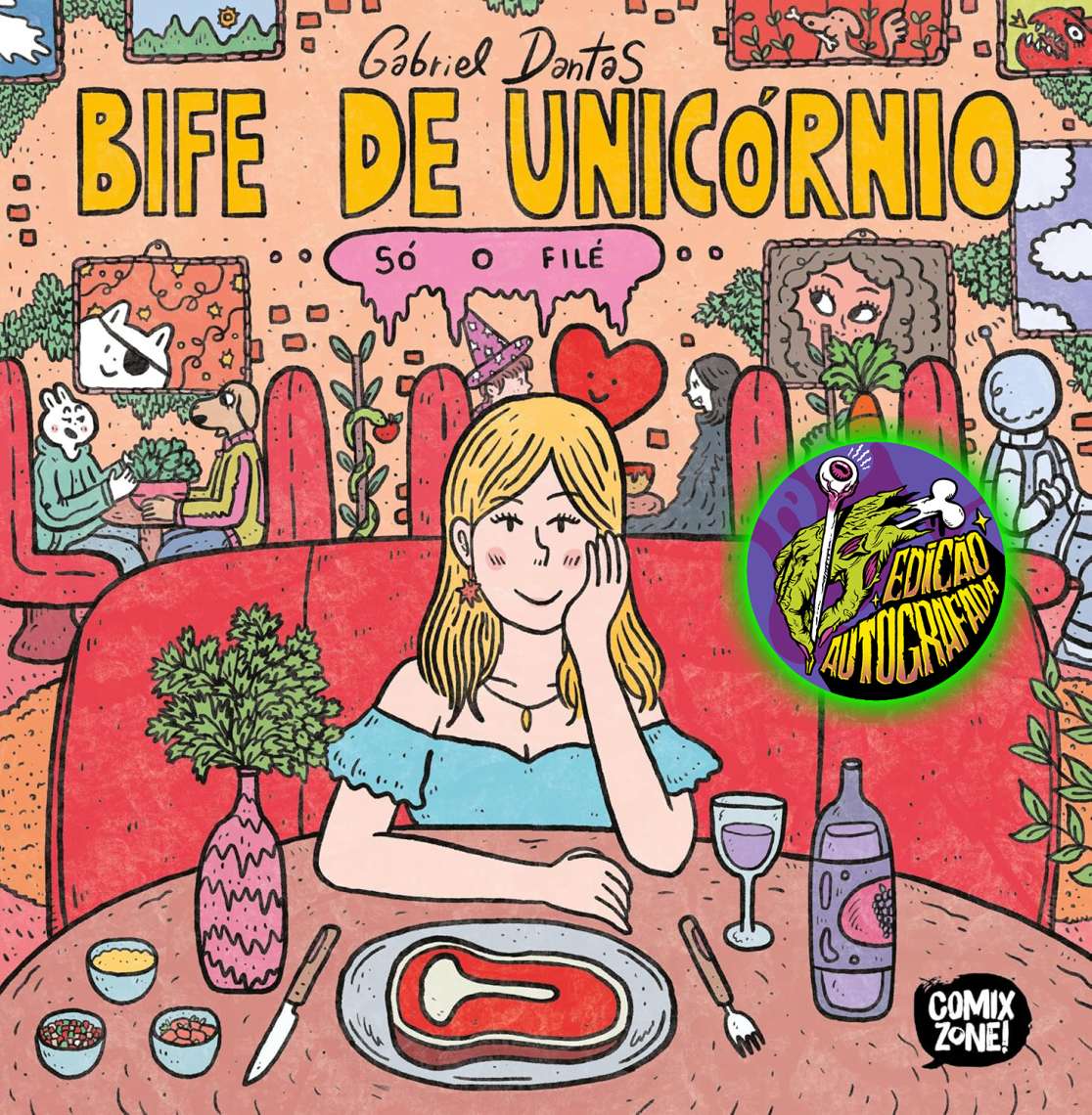 Bife de Unicórnio: Só o Filé é a coletânea definitiva dos quadrinhos de Gabriel Dantas, reunindo o melhor de sua produção entre 2019 e 2024. A edição tem acabamento de luxo, com capa dura e 288 páginas coloridas, impressas em papel pólen de alta gramatura. Acompanha ainda um brinde exclusivo: um livro de colorir com ilustrações inéditas do autor.